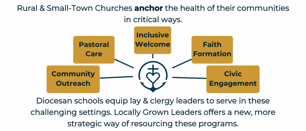The Locally Grown Leaders project is one of 20 projects funded through the Lilly Endowment’s Ministry in Rural Churches and Small Towns Initiative. As stated in the initial request for proposals, the primary goal of this invitational venture is to “support and enhance the vibrancy of Christian congregations serving rural areas and small towns so they are better able to nurture the faith of congregants, to reach out and welcome their neighbors, and to serve as anchor institutions that contribute to the vitality of their communities.” Locally Grown Leaders aims to strengthen the capacity of the Iona Collaborative as a curricular hub for diocesan schools preparing lay and ordained leaders for ministry in rural and small-town contexts. The ultimate vision is to leverage the strengths of the Iona model more fully by partnering with dioceses to re-imagine their schools as anchor institutions serving some of the church’s smallest and most underresourced communities. In this sense, it advances a new, more strategic, and less scarcity-driven way of thinking about local formation.